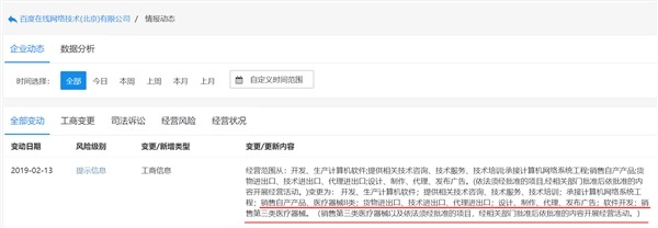 | 2月13日上午消息,企查查信息顯示,百度在線網(wǎng)絡(luò)技術(shù)(北京)有限公司工商信息發(fā)生變更,經(jīng)營(yíng)范圍新增“銷售第三類醫(yī)療器械”、“銷售醫(yī)療器械II類”、“軟件開(kāi)發(fā)”等內(nèi)容。 頁(yè)面顯示,百度在線網(wǎng)絡(luò)技術(shù)(北京)有限公司工商信息變更前經(jīng)營(yíng)范圍包括:開(kāi)發(fā)、生產(chǎn)計(jì)算機(jī)軟件;提供相關(guān)技術(shù)咨詢、技術(shù)服務(wù)、技術(shù)培訓(xùn);承接計(jì)算機(jī)網(wǎng)絡(luò)系統(tǒng)工程;銷售自產(chǎn)產(chǎn)品;貨物進(jìn)出口、技術(shù)進(jìn)出口、代理進(jìn)出口;設(shè)計(jì)、制作、代理、發(fā)布廣告。 變更后經(jīng)營(yíng)范圍具體包括: 開(kāi)發(fā)、生產(chǎn)計(jì)算機(jī)軟件;提供相關(guān)技術(shù)咨詢、技術(shù)服務(wù)、技術(shù)培訓(xùn);承接計(jì)算機(jī)網(wǎng)絡(luò)系統(tǒng)工程;銷售自產(chǎn)產(chǎn)品、醫(yī)療器械II類;貨物進(jìn)出口、技術(shù)進(jìn)出口、代理進(jìn)出口;設(shè)計(jì)、制作、代理、發(fā)布廣告;軟件開(kāi)發(fā);銷售第三類醫(yī)療器械。 此外,企查查信息顯示百度在線網(wǎng)絡(luò)技術(shù)(北京)有限公司由百度控股有限公司百分百持股,其總經(jīng)理和法定代表人均為百度高級(jí)副總裁、百度搜索總裁向海龍。 |