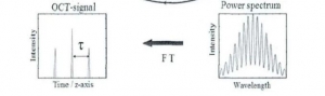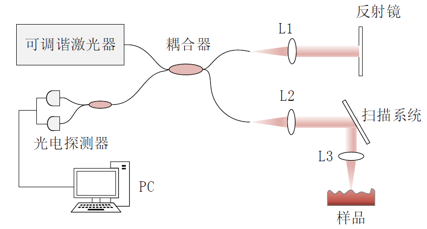 通過傳統(tǒng)的介入手段經(jīng)股動(dòng)脈或者橈動(dòng)脈將一次性使用血管內(nèi)成像導(dǎo)管推送至血管造影顯示狹窄的冠狀動(dòng)脈血管段,利用一定量造影劑排空目標(biāo)血管內(nèi)的血液,并維持大約3~5秒。然后成像主機(jī)控制成像導(dǎo)管的成像探頭在血管內(nèi)360°旋轉(zhuǎn)和回撤,通過成像段完成對(duì)血管的掃描;同時(shí)成像主機(jī)通過光源發(fā)射近紅外光、干涉儀記錄不同厚度血管的反射光、計(jì)算機(jī)重建反射光信號(hào),形成血管內(nèi)斷層圖像。 血管內(nèi)斷層成像設(shè)備采用基于近紅外波段掃頻激光器的頻域OCT成像。成像主機(jī)中的耦合器將掃頻激光器(圖4中的可調(diào)諧激光器)發(fā)出不同波長的光分成兩束(參考光和樣品光),參考光通過透鏡 L1并被反射鏡反射并反向傳輸至耦合器;樣品光依次通過透鏡L2、掃描系統(tǒng)和透鏡L3入射至樣片點(diǎn),L3接收被樣品反射的光并反向傳輸至耦合器;樣品光和參考光在耦合器干涉后通過光電探測(cè)器轉(zhuǎn)換成電信號(hào)傳輸至電腦(PC),光電探測(cè)器采集到x軸是波長,y軸是強(qiáng)度的干涉條紋,對(duì)該干涉條紋進(jìn)行傅里葉變化即可得到該點(diǎn)處不同深度的反射信號(hào)。