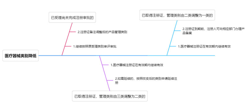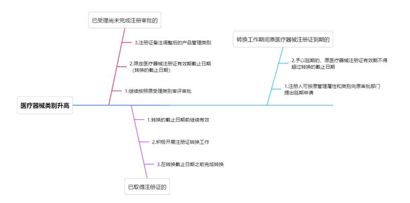 二、管理類型升高 1、已受理醫(yī)療器械 對于公告發(fā)布之日前已受理尚未完成注冊審批(包括首次注冊和延續(xù)注冊)的醫(yī)療器械,藥品監(jiān)督管理部門繼續(xù)按照原受理類別審評審批,準予注冊的,核發(fā)醫(yī)療器械注冊證,限定醫(yī)療器械注冊證有效期截止日期為過渡期截止日期,并在注冊證備注欄注明調(diào)整后的產(chǎn)品管理類別。 2、已取得二類醫(yī)療器械注冊證